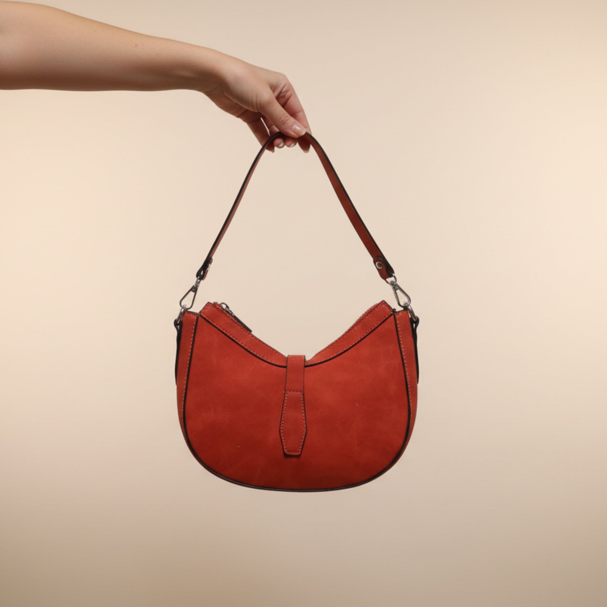 Borsa a mezzaluna effetto scamosciato, leggera e pratica. Dotata di doppia tracolla removibile per essere portata a mano, a spalla o a tracolla. Chiusura con zip e taschino interno con zip. Ideale per un look moderno e funzionale.